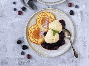 Pancakes mit dunkler Beerengrütze und Vanille-Bourbon Eis