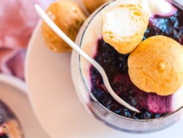 Windbeutel Dessert mit Waldheidelbeeren im Glas