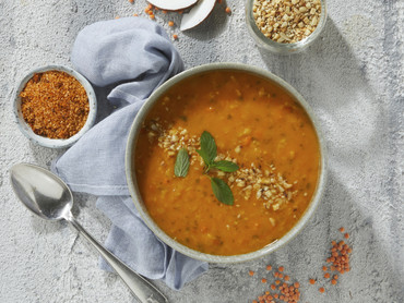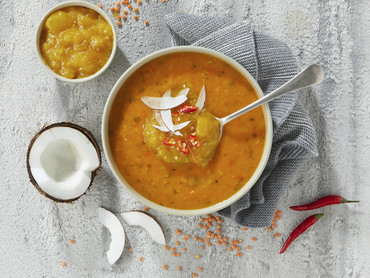 Rote Linsen-Kokos-Suppe mit Mango Chutney
