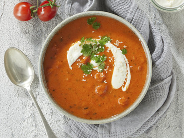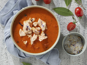 Tomatensuppe mit pochiertem Lachs & BIO Blüten-Salz-Pfeffer