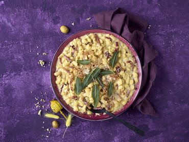 BIO Eierknöpfle-Auflauf mit Gorgonzola, Südtiroler Speck & knusprigem Salbei