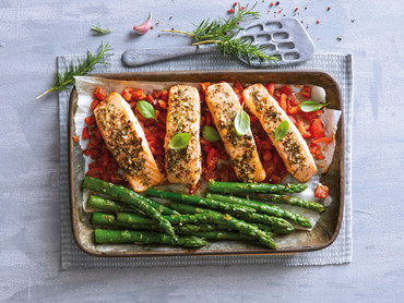 Lachsschnitte - geschmolzene Tomate mit grünem Bratspargel