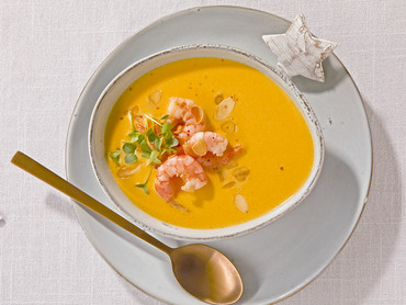 Mandel-Riesengarnelen an Möhren-Ingwersuppe