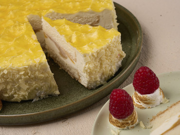 Panna-Cotta-Pfirsichtorte mit Baiser und Himbeeren