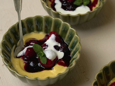 Rote Grütze mit selbstgemachtem Vanillepudding und Sahne