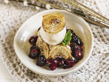 Haselnuss-Johannisbeereis mit Blätterteig-Gewürz-Schnecken und Beerenfrüchten