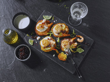 Knusprige Röstinchen mit Jakobsmuschel & Riesengarnele