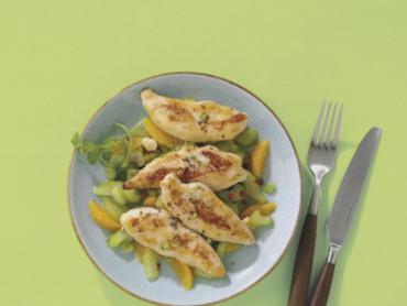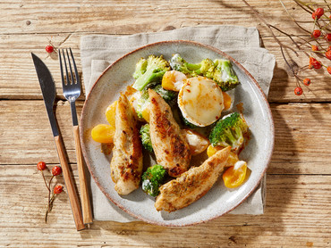 Knusprige Hähnchen-Innenfilets mit Broccoli-Aprikosen-Auflauf