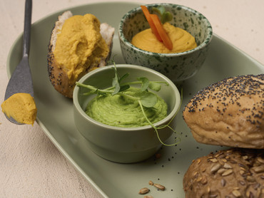 Brötchen mit Avocado-Erbsen-Creme und Kichererbsen-Humus