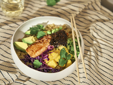 Buddha Bowl mit Lachs, Quinoa & rotem Noripesto