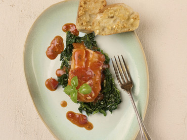 Kabeljau in Tomaten-Kräuter-Sugo und Knoblauch Baguette