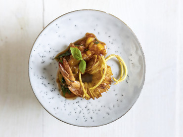 Riesengarnele mit Kartoffelspaghetti und Sweet Chili Soße (von Johann Lafer)