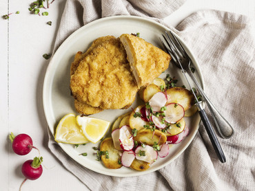 Hähnchenschnitzel Wiener Art und lauwarmer Bratkartoffelsalat