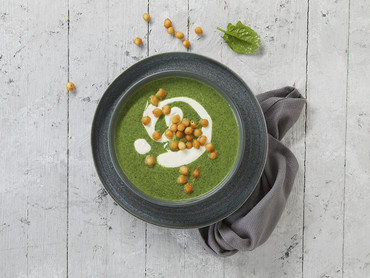 Spinat-Rahmsüppchen mit knusprigen Dinkel Backerbsen