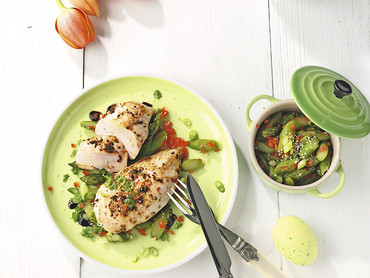 Hähnchenbrustfilet mit lauwarmem Spargelgemüse