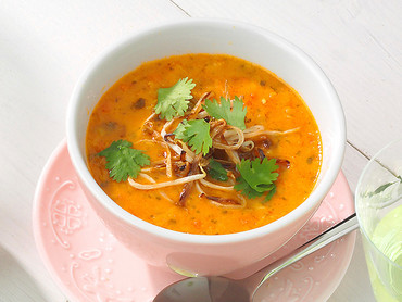 Rote Linsen Kokossuppe mit Sesam Sprossen