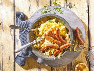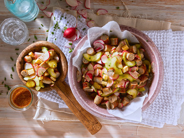 Bunter Bratwurstsalat mit Radieschen, Gurke und Käse